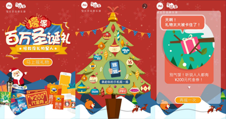 就在剛剛過去的圣誕節(jié),寶潔生活家俱樂部利用微信卡券做了一次非常成功的營銷,用戶通過“搖一搖”獲得獎品,大多數(shù)用戶會得到200元的寶潔系列產(chǎn)品代金券,在代金券頁面點(diǎn)擊“立即使用”可直接跳轉(zhuǎn)到微商城使用代金券購物。另外,理論上用戶可以有無數(shù)次搖獎的機(jī)會,因?yàn)橛脩裘糠窒硪淮雾撁婢湍艿玫揭淮螕u獎機(jī)會,也正是這樣的機(jī)制極大的激發(fā)了用戶的分享欲望。據(jù)悉,該H5頁面取得了每秒3w互動的驚人效果。